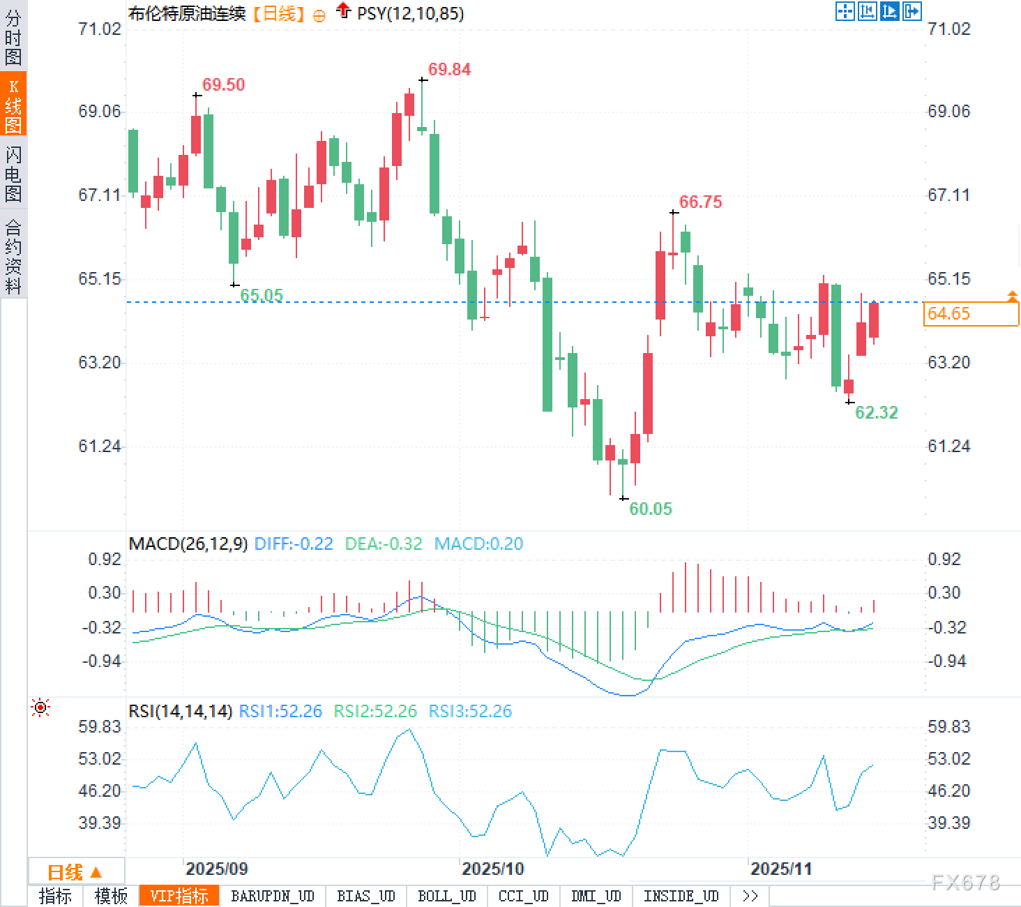 布伦特原油主力日线显示,自前期69.8一线高点回落后,整体维持台阶式下行结构,60.05一线形成阶段低点,之后反弹高点未能突破前高,区间收窄至约60-67美元。目前价格64.65美元,处于区间中部偏上位置,K线在62.3附近获得支撑后连续数日小阳线修复,短期抛压有所缓和。