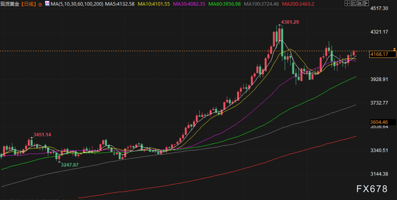 周四(北京时间11月27日)亚市早盘,现货黄金交投于4167.57美元/盎司附近,金价周三延续涨势,攀升至逾一周高位