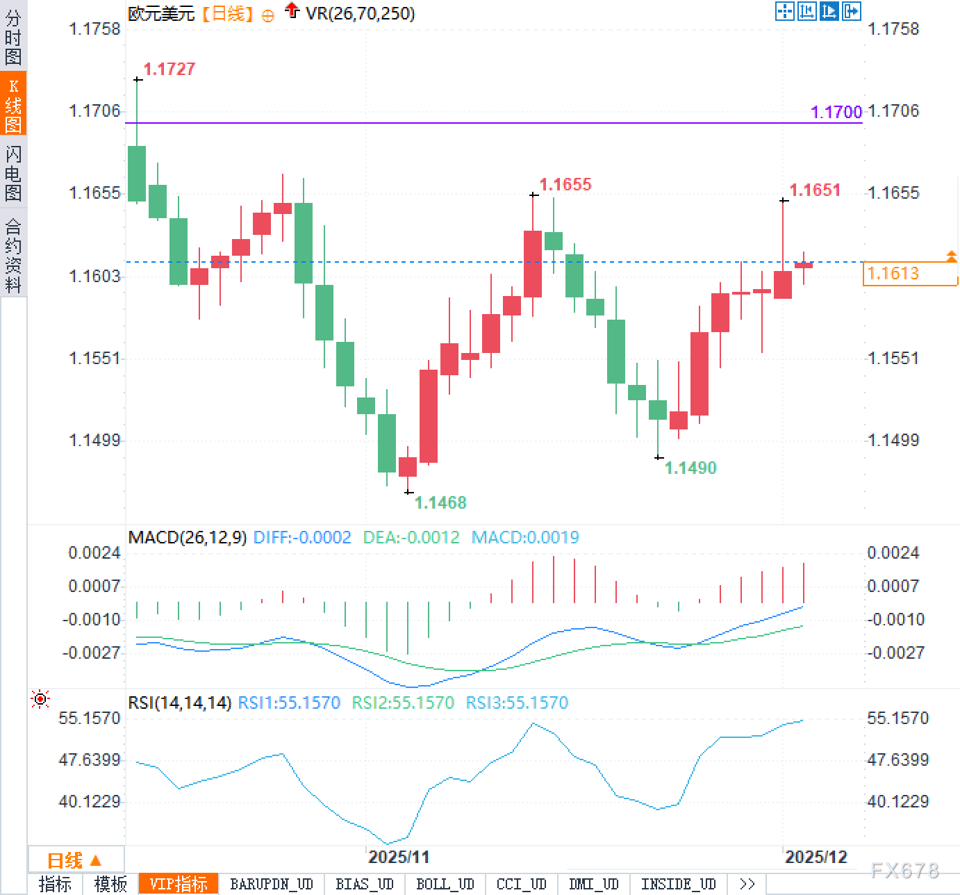汇通财经APP讯——周二(12月2日),欧元兑美元汇价在北美时段维持窄幅震荡格局,现报1.1613,较周一自1.1650区域回落后企稳。欧元区通胀意外升温与失业率攀升形成矛盾信号,而美元在避险情绪支撑下暂获喘息,多空双方在关键技术位展开拉锯。