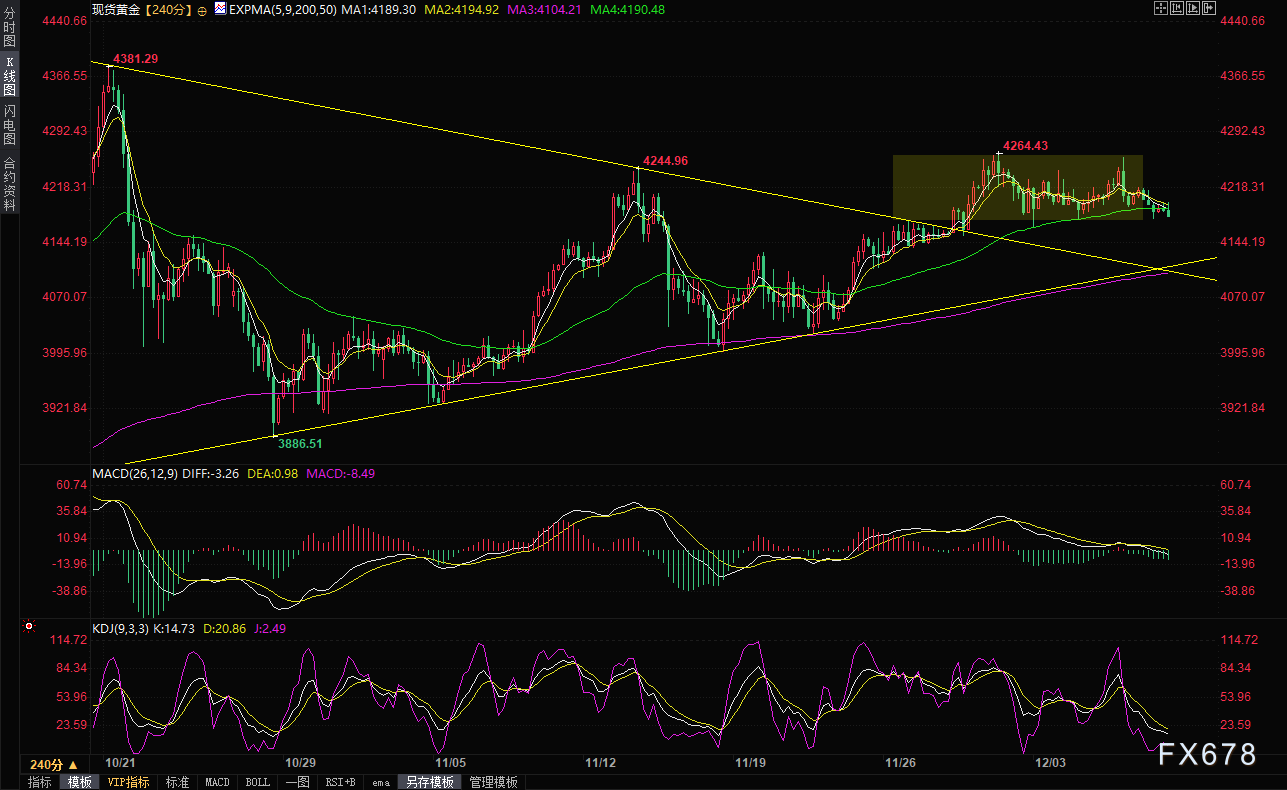 下行方面,4174-4175区域可能提供即时支撑,其次是月度低点4163-4164区域附近。若跌破此处,将使黄金价格容易加速下跌,测试4100美元下方水平。后者是一条自10月底延伸的短期上升趋势线,若被决定性跌破,将被视为熊市交易员的新触发因素,并为更深跌幅铺平道路。