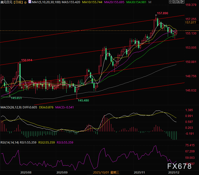 汇通财经APP讯——周一(12月8日)亚欧时段,美元兑日元下探至154.90附近后展开反弹走出探底回升的走势,暗示了美元兑日元下跌力量的衰减,但再次之前日元已经连续升值约两周,同时日本十年期国债收益率继续创高,暗示着日元可能继续走强。