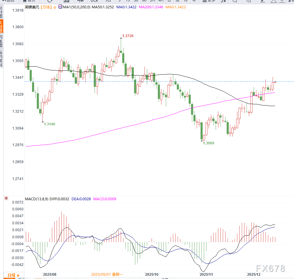 阻力位1.3450附近,进一步阻力位于1.3500整数关口;
