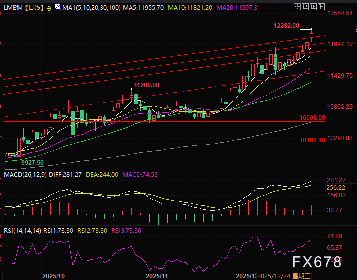 汇通财经APP讯——周三(12月24日)亚欧时段铜价强势刷新历史纪录,伦敦金属交易所铜现货报价一举站稳12000美元,盘中更是快速拉升超过1%触及12282美元的高位,2025年以来累计涨幅飙升接近40%,创下2009年以来的最大年度涨幅。